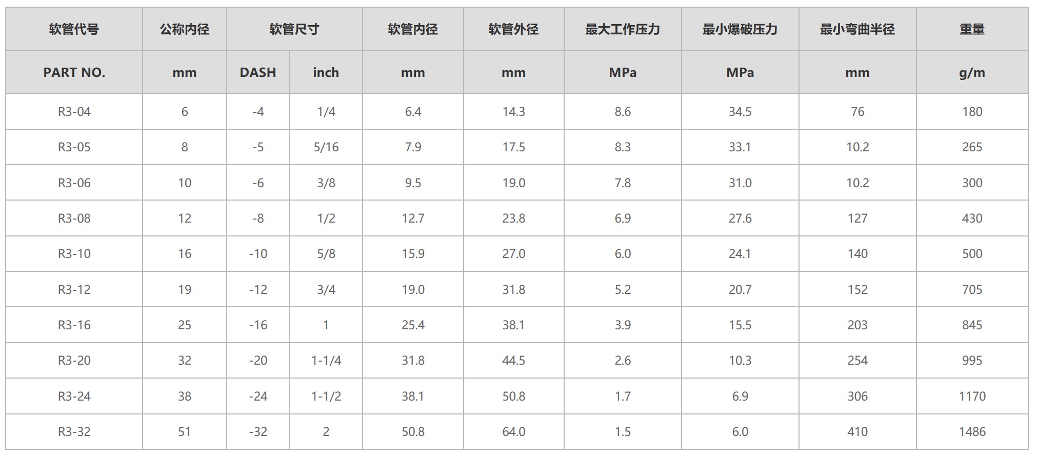 石油基液壓油, 水乙二醇 油水乳化液,油脂,潤(rùn)滑油,原油、燃油, 空氣和水。用于1.7 MPa以上的壓縮氣體場(chǎng)合,軟管需針刺。